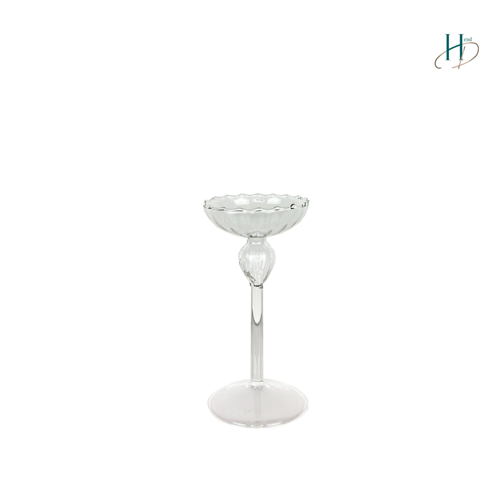 Szklany świecznik na cienkiej nóżce.
